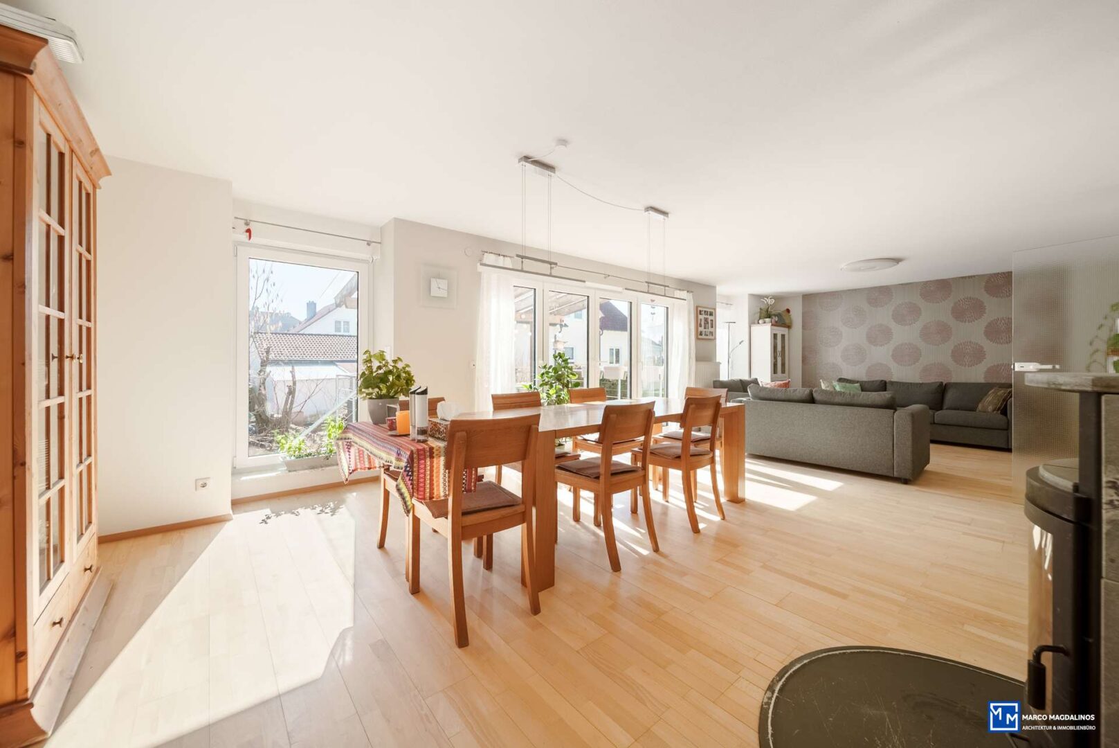 Die große Fensterfront im Wohn-Essbereich bietet direktem Zugang zur überdachten Terrasse, ideal nach Süd-Westen ausgerichtet, von hier aus erschließt sich auch direkt der Garten.