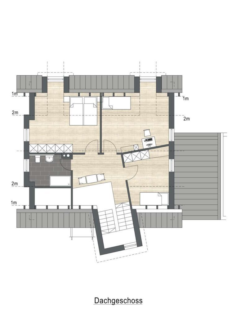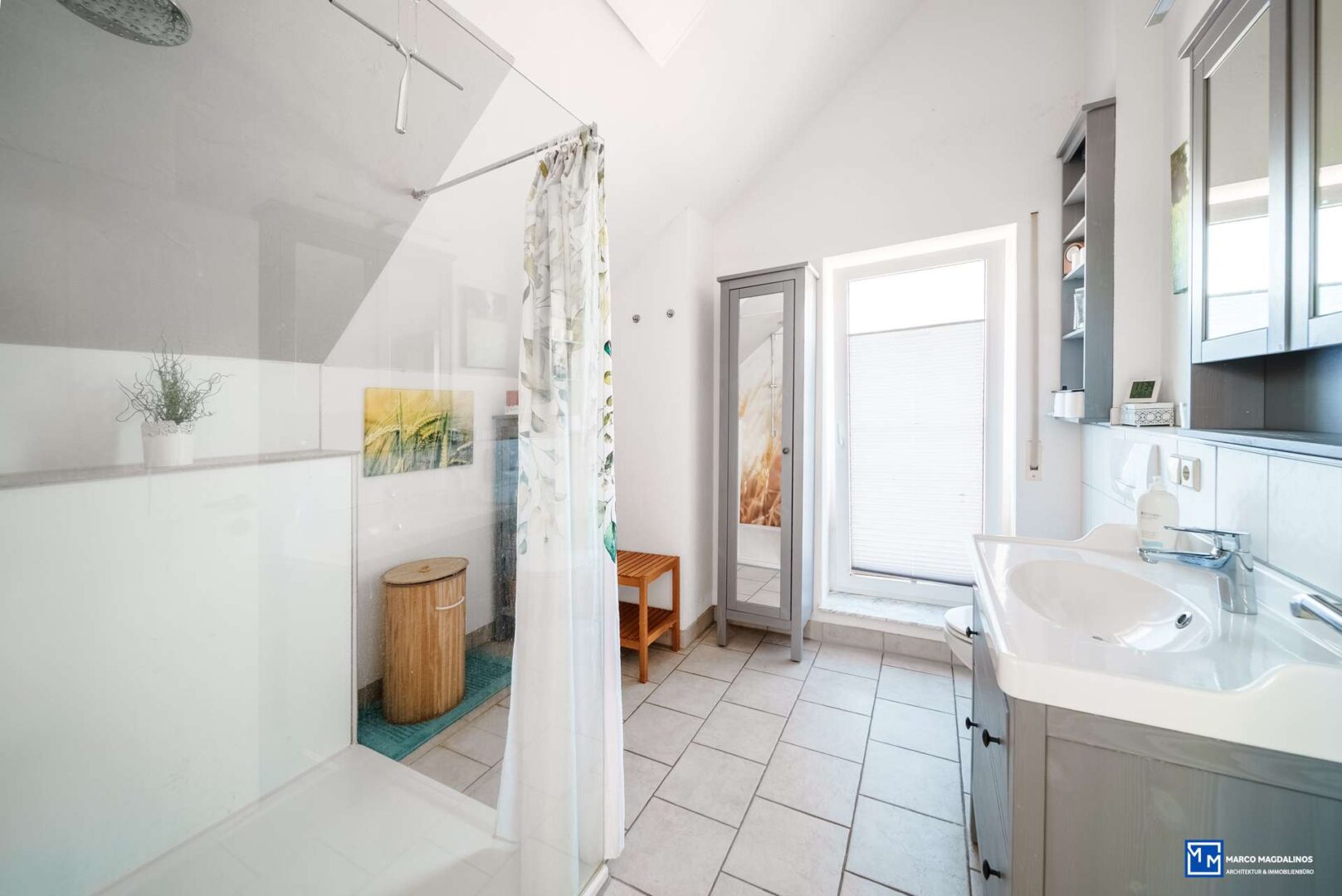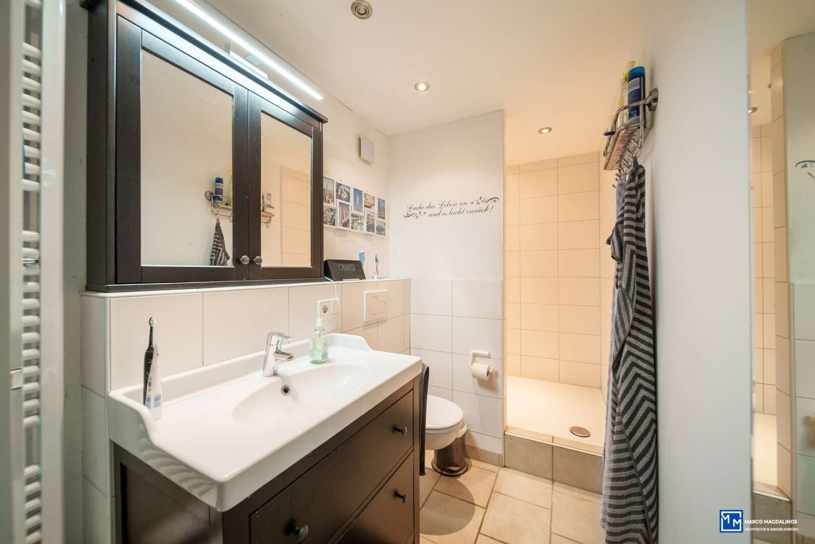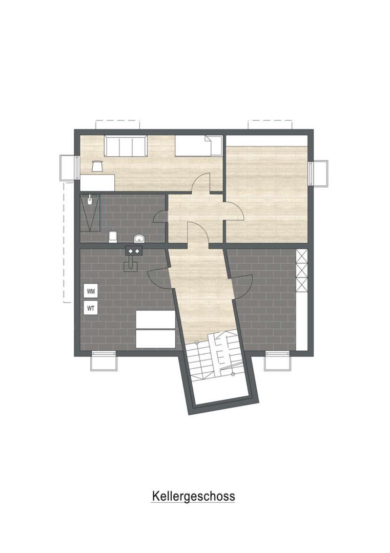Zwei moderne Bäder sorgen für Komfort, im Dachgeschoss ist das Tageslicht Bad mit einer Dusche, Waschbecken und WC ausgestattet. Im Keller ist ein zusätzliches Bad, ebenso mit Dusche, Waschbecken und WC nachträglich eingebaut worden. Ein Gäste-WC ist ebenfalls im EG vorhanden und ergänzt die praktische Ausstattung.