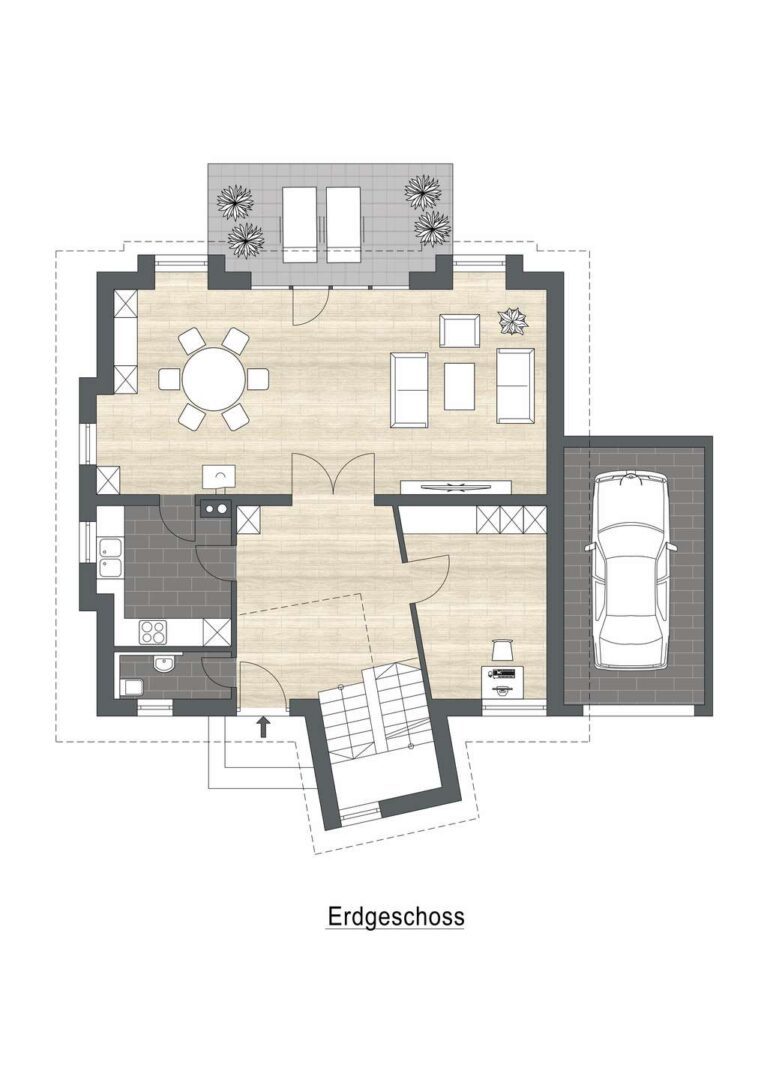 Die gehobene Ausstattung umfasst eine stilvolle Einbauküche, die keine Wünsche offenlässt. Genießen Sie gemütliche Abende am Kamin im Wohn- Essbereich oder entspannen Sie auf der Terrasse, die genügend Platz für Ihre eigenen Ideen bietet.